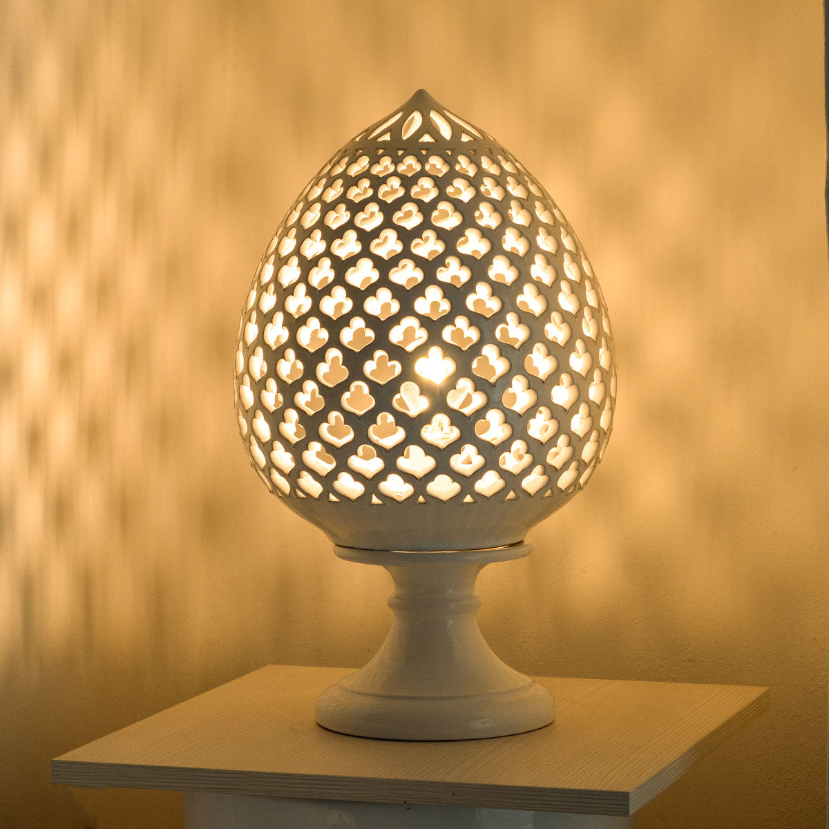 Questa lampada "Pumo" nasce dall'antica tradizione artigianale della ceramica, combinando design raffinato e maestria manuale. Ogni pezzo viene forgiato al tornio e, durante la fase di essiccazione, accuratamente traforato a mano con precisione meticolosa, creando un gioco di luci unico.
